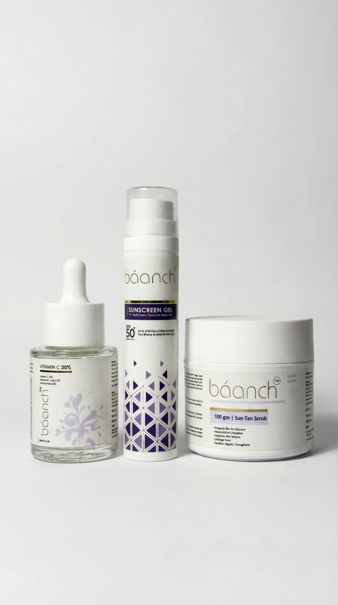 The Baanch Summer De-Tan Glow Combo is a 3-step skincare routine designed for tan removal, summer dullness recovery, brightening, and daily UV protection.